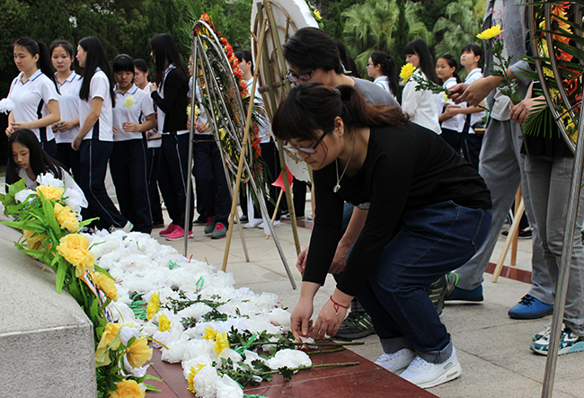 在慷慨激昂的国歌中,扫墓活动正式展开。国歌过后,全体师生肃立,默哀一分钟。随后,学生代表向英雄纪念碑敬献花圈,其他学生则献上鲜花,并瞻仰纪念碑。