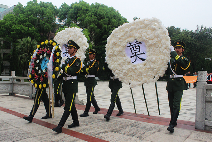 伴随着《义勇军进行曲》的响起,国旗护卫队的学生代表们踏着整齐响亮的正步为革命先烈献上了花圈。随后,现场所有胸前佩戴白花的师生集体为革命先烈默哀一分钟,以示向他们为革命事业做出的贡献致敬。