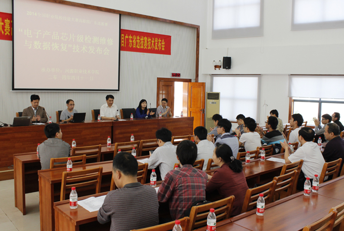 4月11日,2014年全国职业院校技能大赛高职组“电子产品芯片级检测维修与数据恢复”项目广东选拔赛技术发布会在我校召开。副校长陈德清,教务处、电信学院负责人,技术专家,各参赛学校领队、指导老师及参赛学生出席此次发布会。