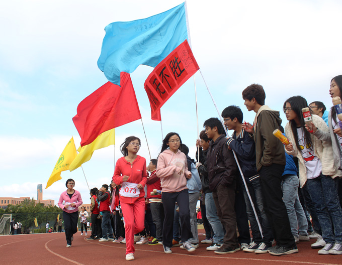 虽临近校运会闭幕,但赛场内外还是聚集许多观众助威团。随着一声枪响,运动员倾力争跑,双脚在赛场驰骋,竭力为荣誉而战。同时,啦啦队的热情呼喊和加油声,也再次点燃了全场运动激情。