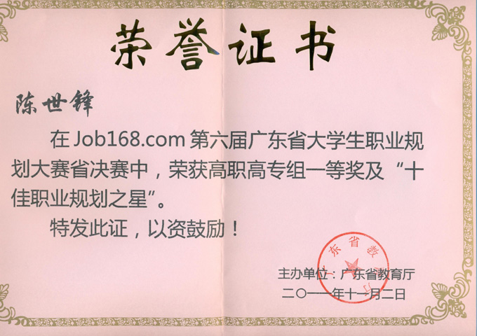 2011年11月2日上午, Job168.com第六届广东省大学生职业规划大赛在广东工业大学(大学城校区)举行了颁奖典礼,我校学生09数控技术(3)班专业陈世锋、09工业设计(1)班专业郭晓静分别荣获第六届广东省大学生职业规划大赛决赛(高职高专组)一、二等奖,郭晓静还获得“最佳规划展示奖”、“ 最佳回答提问奖”;郑文明老师获“优秀指导老师奖”。