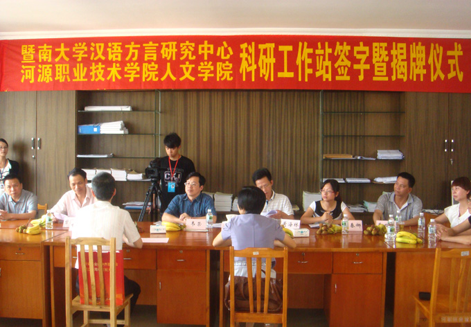 在揭牌仪式上,韦荣副书记首先致辞。他说,暨南大学汉语方言研究中心赢博线上官网(集团)官方网站科研工作站落成对我校开展客家方言调查研究以及客家历史文化的研究提供了极大的便利,对河源地区的客家方言调查与研究具有深远意义,并要求主要承担此工作的人文学院能借科研工作站落成的契机在客家方言研究等方面提升科研水平。接着,甘于恩教授致辞。他简要地介绍了暨南大学汉语言方言研究中心的研究方向和学科建设等相关情况,并希望今后进一步加强与我校的合作,开展对河源地区方言资源研究和应用。之后,人文学院院长黄海林和暨南大学汉语方言研究中心主任甘于恩教授共同签署《暨大汉语方言研究中心与赢博线上官网(集团)官方网站人文学院关于联合建立赢博线上官网(集团)官方网站科研工作站的协议书》,并为该科研工作站揭牌。最后,暨南大学汉语言方言研究中心的专家与我校人文学院的教师座谈,并向我校赠送有关方言著作一批。