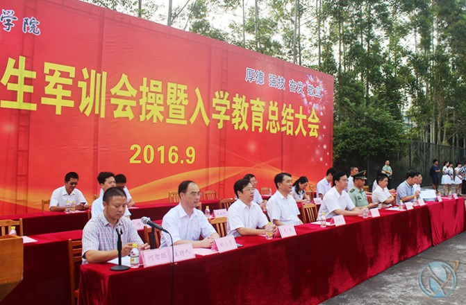 (宣传部通讯员 俞卓青)9月23日上午8:00,2016级新生军训会操暨入学教育总结大会在我校足球场隆重举行。校领导班子,武警河源支队领导,学生工作处、保卫处全体人员,各学院院长、副书记、团总支书记及辅导员、助理辅导员,以及2016级全体新生出席参加了总结大会。大会由学工处处长何智聪主持。