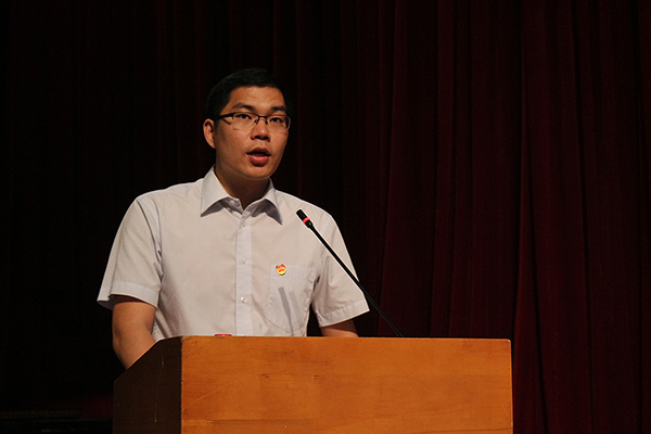 副校长赖小景及团委书记陈晓峰为培训班学员代表授书。随后,赖小景为培训班全体学员们作了《长征—不朽的红色记忆》纪念红军长征胜利80周年教育讲座。他围绕“长征”这一主题,以图文并茂的方式解析“什么是长征”、“为何要长征”、“长征的部队”、“长征的过程”、“长征的意义”等五个方面的内容,并结合历史史实、英雄事迹、相关诗词等形式加深学员们对“长征”的理解。