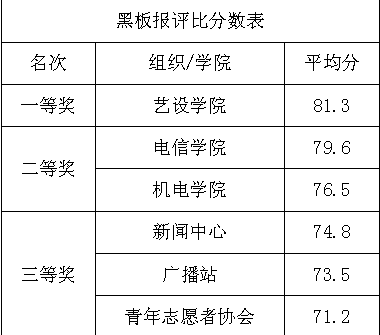 本次黑板报评比由各大学生组织、二级学院的学生干部代表组成的评审组,严格按照黑板报评比规则,本着“三公”的原则,从“主题、内容、结构设计、版面、整体效果及创新性”等六个方面,对各大学生组织、各二级学院的每幅黑板报进行了认真的评比和打分。评比期间,各大学生组织、二级学院代表对各自的黑板报进行介绍和讲解,再由评委组进行讨论,提出意见和看法,并对每一块黑板进行评分。评比过程融洽活跃,参与评比的代表认真地对参评黑板报进行了评审和评分。最终经评分计算,艺术与设计学院以平均分81.3荣获一等奖;电子与信息工程学院与机电工程学院分别以平均分79.6、平均分76.5荣获二等奖。