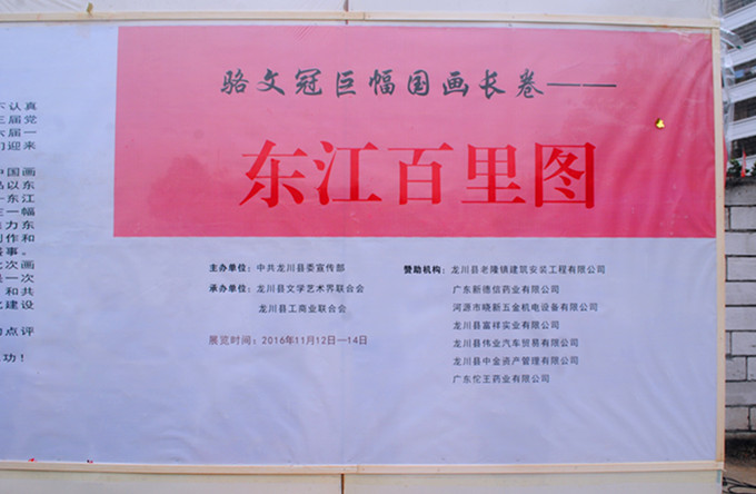 市政协副主席梁国华等领导嘉宾为画展揭幕。《东江百里图》以东江为对象,骆文冠先生从江西境内的源头起笔,取三百山、连平桃花、和平新城、林寨古村、霍山、龙川县城、佗城古镇、万绿湖、红色紫金、深圳等景色入画,将两岸山水和客家民俗风情表现在一幅长卷上,画面恢宏,技法精湛,令观众啧啧称奇。