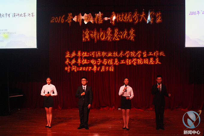 (学生工作处通讯员 曾智祥,学生文字记者 刘欣瑜、吴海霞)1月3日晚,我校于学术报告厅举行2016年“讲诚信,争做优秀大学生”主题演讲比赛。此次演讲比赛以我校全面开展学风建设为契机,大力宣扬社会主义核心价值观。学生工作处处长何智聪、各二级学院团总支书记、指导老师以及电子与信息工程学院学生会干部、400余名学生代表到场为参赛选手加油。国家普通话水平测试考官郑尔君、学生工作处管理科科长邹远泉、国家中级礼仪培训师罗丽丽、河源青年主持人协会秘书长欧阳可强、创业指导师邹建辉等五位担任大赛评委。