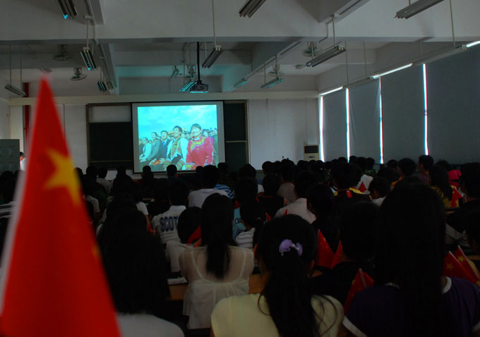 10月1日上午,我校留校师生等数百人欢聚一堂,于教学楼C201共同观看新中国华诞60周年阅兵活动现场直播。