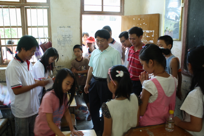 在紫金苏区中学教学楼里,陈农心副校长、黄向明副校长也和志愿者们深入交流,并为志愿者们送上了慰问金。他们表示,紫金苏区是革命老区,志愿者们要认真学习红色文化,要借此“三下乡”社会实践活动的机会深入农村、贴近群众,为群众办实事、办好事。希望志愿者们团结协作,珍惜短短十天时间的“三下乡”社会实践活动带给自己的宝贵经历。