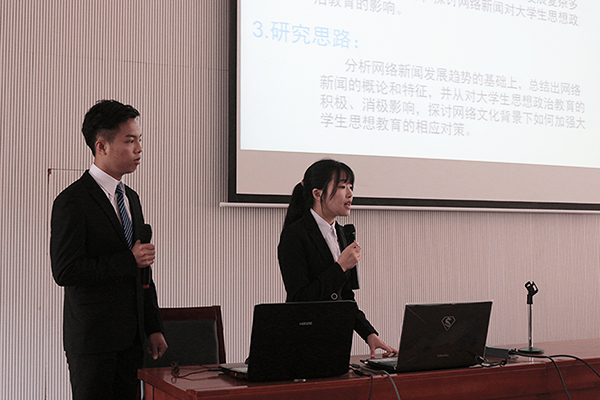竞赛伊始,参赛选手以其饱满的热情进入竞赛现场,紧接着,在主持人宣读了比赛规则后,赛事便井然有序的进行。比赛中,各参赛选手通过PPT作品形式向评委老师讲述选题缘由及目的、研究方法、研究结果、研究结论等方面对作品进行展示,充分体现了其团队项目的精彩之处及优势所在。与此同时,评委老师按照参赛作品的类型向选手们提出关于作品的一些关于用途、预算、资金等问题,并指出需要改进的方面。