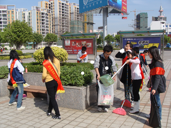 3月14日,我校电子与信息工程系08软件班自发组成的环保服务队,在辅导员刘老师及班委的带领和组织下,全体同学对河源火车站进行了两个多小时的环保工作。其中包括火车站广场的清扫和候车室座位、地板和栏杆的清洗。