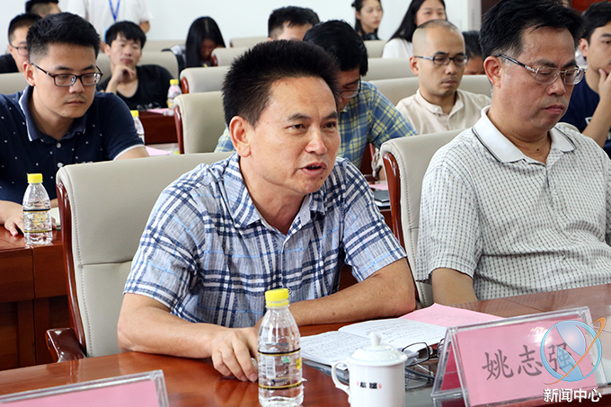 会议第三项议程为嘉宾发言。市委党史研究室副主任杨石健、河源日报社副社长司雁人、市社科联副主席姚志强、市委党校副校长陈跃华、市人大常委会秘书长陈其明等五位嘉宾相继发言。杨石健认为,河职院红研中心做了大量工作,成绩显著,河源红色文化研究到了新的研究阶段,离不开社会各界的支持,希望对河源红色文化研究感兴趣的社会各界人士可以继续为河源红色文化点赞,红研中心能够继续提供更为丰富和深厚的研究成果;司雁人希望年轻人能够多参与红色文化研究,研究队伍能够不断壮大;姚志强建议将红色文化研究课题列入重点课题,弘扬和发展红色文化需要专家、研究爱好者们的积极参与;陈跃华表示,《红色河源》可以作为使党委、党校工作更接地气的优秀载体,在红色文化研究中学习与提升;陈其明对红研中心的工作大加赞许,认为中心负责人有担当,有激情,做了大量富有成效的工作,并建议中心今后工作要有规划、有好的激励机制和建立好的奖励制度。