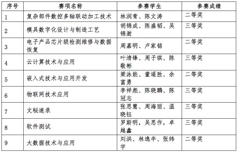据了解,今年我校代表广东省参加全国职业院校技能大赛的9个赛项,共获得4项二等奖、5项三等奖。2017年全国职业院校技能大赛于5月8日至6月8日在天津、吉林、江苏等19个赛区分别举行。共有来自全国37个地区的13655名选手参加了中、高职组81个项目的比赛。