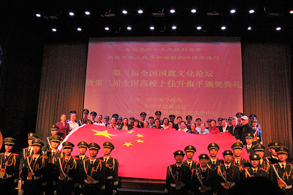29日下午,在清华大学大礼堂举行的第三届国旗文化论坛暨十佳升旗手颁奖典礼中,我校国旗护卫队优秀队员代表尹霭瑜同学荣获全国高校十佳标兵荣誉称号,此项评选自4月份启动,由团中央学校部大学处、教育部思教司、全国学校升旗手总教官和媒体专业人士组成评审团,结合网络投票情况,分别从基础队列动作、升旗技术动作、国旗法规、精神风貌、个人荣誉等方面进行严格评审。我校尹蔼瑜同学凭借扎实的理论知识及实战技能通过严格的现场考核,最终被评为第二届全国高校十佳标兵升旗手,团中央学校部副部长李骥为我校代表队尹蔼瑜同学颁发证书。