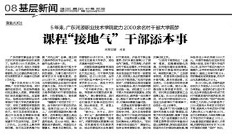10月10日,国内惟一一份国家级的,面向全国教育界的教育日报,目前中国最具权威和最有影响力的教育新闻媒体《中国教育报》以《课程“接地气” 干部添本事——5年来,广东赢博线上官网(集团)官方网站助力2000余名村干部大学圆梦》为题,在第8版基层新闻头条,对我校村干部大专班项目进行了专题报道,认为该项目真正“做到干部的培养与群众需求、村情实际需要无缝对接”。