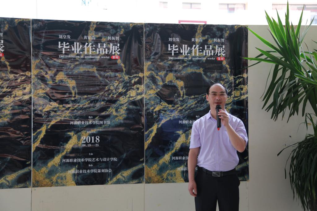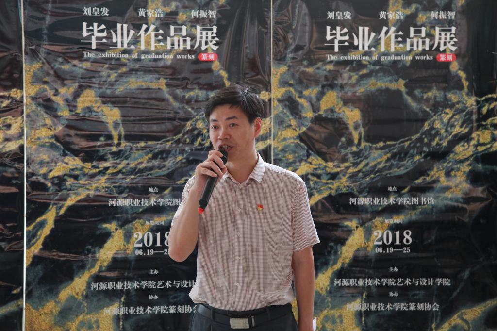6月19日10:00,艺术与设计学院学子刘皇发、黄家浩以及何振智篆刻毕业展在学校院图书馆举行开幕式。河源市书法协会主席张文峰,我校副校长赖小景、宣传部部长杨海燕、学工处处长何志聪、图书馆馆长赖新优、学工处副处长柳晓夫等领导莅临现场参观指导。艺术与设计学院师生代表、书法协会相关人员以及书法篆刻爱好者参加了开幕式。仪式由艺术与设计学院院长杜伟祥主持。