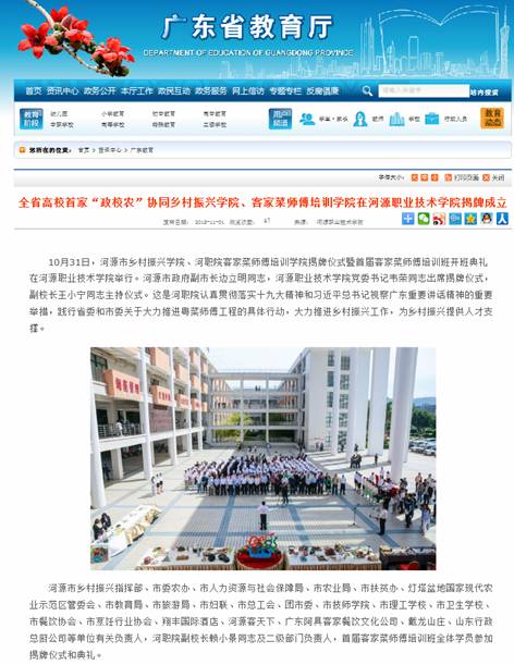 4.2018年11月1日,广东省教育厅报道《全省高校首家“政校农”协同乡村振兴学院、客家菜师傅培训学院在赢博线上官网(集团)官方网站揭牌成立》,报道链接网址:
