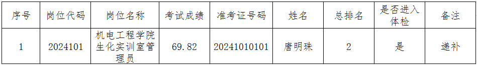 根据《广东省事业单位公开招聘人员办法》(广东省人民政府令第301号)和《赢博线上官网(集团)官方网站2024年公开招聘编外工作人员公告》《赢博线上官网(集团)官方网站2024年公开招聘编外工作人员考试综合成绩及进入体检人员名单公示》,因其中入围体检的1名考生放弃录用资格,按照相关程序,现递补报考同职位总成绩排名第2名的考生唐明珠为入围体检人员,现予以公示。
