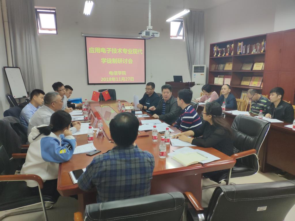 会上,电信学院杨黎院长对应用电子技术专业现代学徒制人才培养方案进行了解读,并说明了此次研讨会的主题。指出了2017级现代学徒制班在教学方面存在的问题,提出了解决思路。