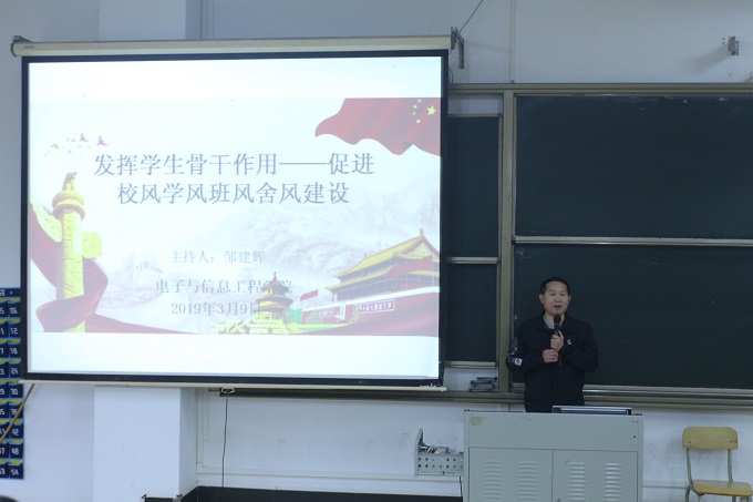 3月9日上午,电信学院在教学楼D206开展第十二届团总支、学生会学生干部“青马工程”班系列培训四之《发挥学生骨干作用——促进校风学风班风舍风建设》讲座。第十二届团总支学生会全体成员、各协会正副会长、18级各班班长和团支部书记参加培训。讲座由杨日奎老师主持,邹建辉老师主讲。