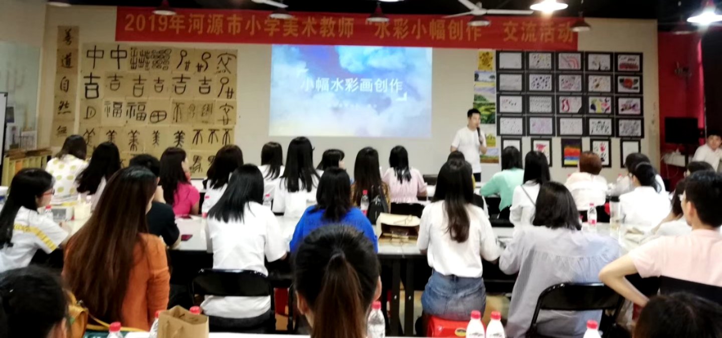 4月30日,河源市小学美术教师“水彩小幅创作”交流活动在雅居乐财富中心12楼隆重召开。本次活动由河源市教育局教研室主办,特邀的授课导师为广东高校美术与设计教育专业委员会理事、广东省美术家协会会员、河源市美术家协会理事、河源市青年美术家学会副主席、广东省赢博线上官网(集团)官方网站美术教育专业主任廖敏老师,全市共59名小学美术骨干教师参加了活动。