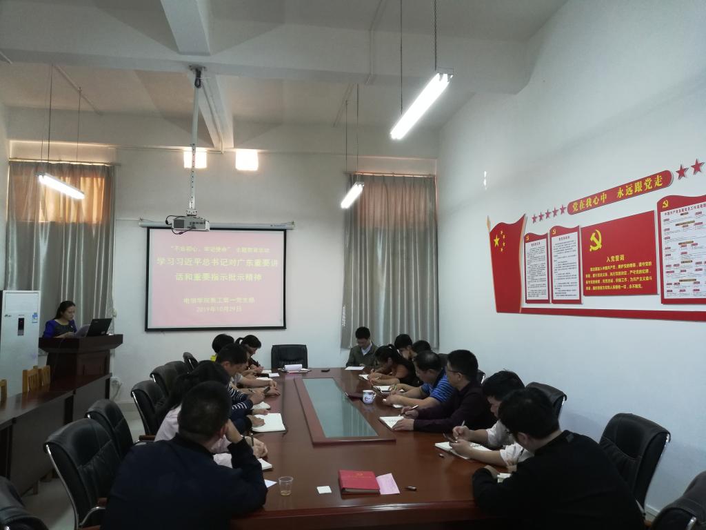 为了进一步推动学校“不忘初心、牢记使命”主题教育深入开展。电信学院教工第一党支部于10月29日在学院会议室组织学习习近平总书记对广东重要讲话和重要指示批示精神。