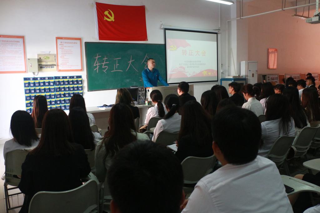 大会伊始,刘毅上台说明大会的主要内容,接着赖李斌、严荣发等十一位预备党员依次宣读转正对象申请书。预备党员们对近一年来的思想、生活、工作情况进行总结,并承诺会发挥党员先锋模范作用,严格要求自身,履行党员义务,坚定共产主义信念,为党和人民的利益奋斗。紧接着,支部书记杨日奎上台宣布赖李斌、严荣发等十一位预备党员转为中共正式党员,且强调身为党员必须遵守党章的规章制度和认真完成我校交给党员的各项工作。随后,杨日奎同志要求转正的十一位党员需做到在学生中树立榜样,提高自己的政治站位,在学生日常生活与工作中发挥排头兵的作用,围绕着学校党支部履行党员义务,更好的服务群众。最后,杨日奎同志号召在场的预备党员要以十一名党员为榜样,戒骄戒躁,克服不足,在学习和工作中紧跟正式党员的脚步,努力提高自身道德修养与思想觉悟,为党和人们的事业做出更大的贡献。