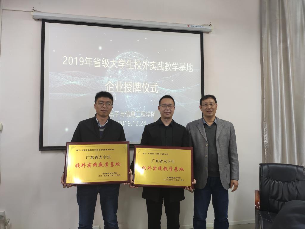 随后,举行了2019年省级大学生校外实践教学基地企业授牌仪式。王富宽院长分别为中兴通讯(河源)有限公司和河源市智成通工程项目咨询管理有限公司颁发牌匾。