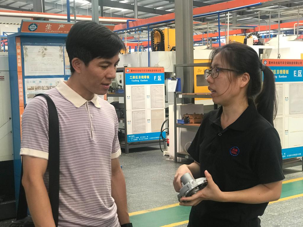 9月3日,钟建坤院长率队赴广州市光裕汽车空调制造有限公司惠州工厂走访调研,受到李小敏总经理等公司领导的热烈欢迎。该公司成立于2006年,是一家专业研发设计和生产销售汽车空调压缩机及配件的国家高新技术企业。调研团首先参观了生产车间,深入了解产品的生产流程、现场管理、质量监控,车间布局合理、标识清楚、分区规范,并详细了解了学生顶岗实习的具体岗位及职责。随后,调研团在公司会议室观看了企业宣传视频,全面了解了企业的发展历程、生产规模、产品信息、研发能力等。接着,校企双方就共同开展人才培养、技术开发、学生顶岗实习等内容进行深入研讨,并达成共同育人、研发新产品等合作意向。