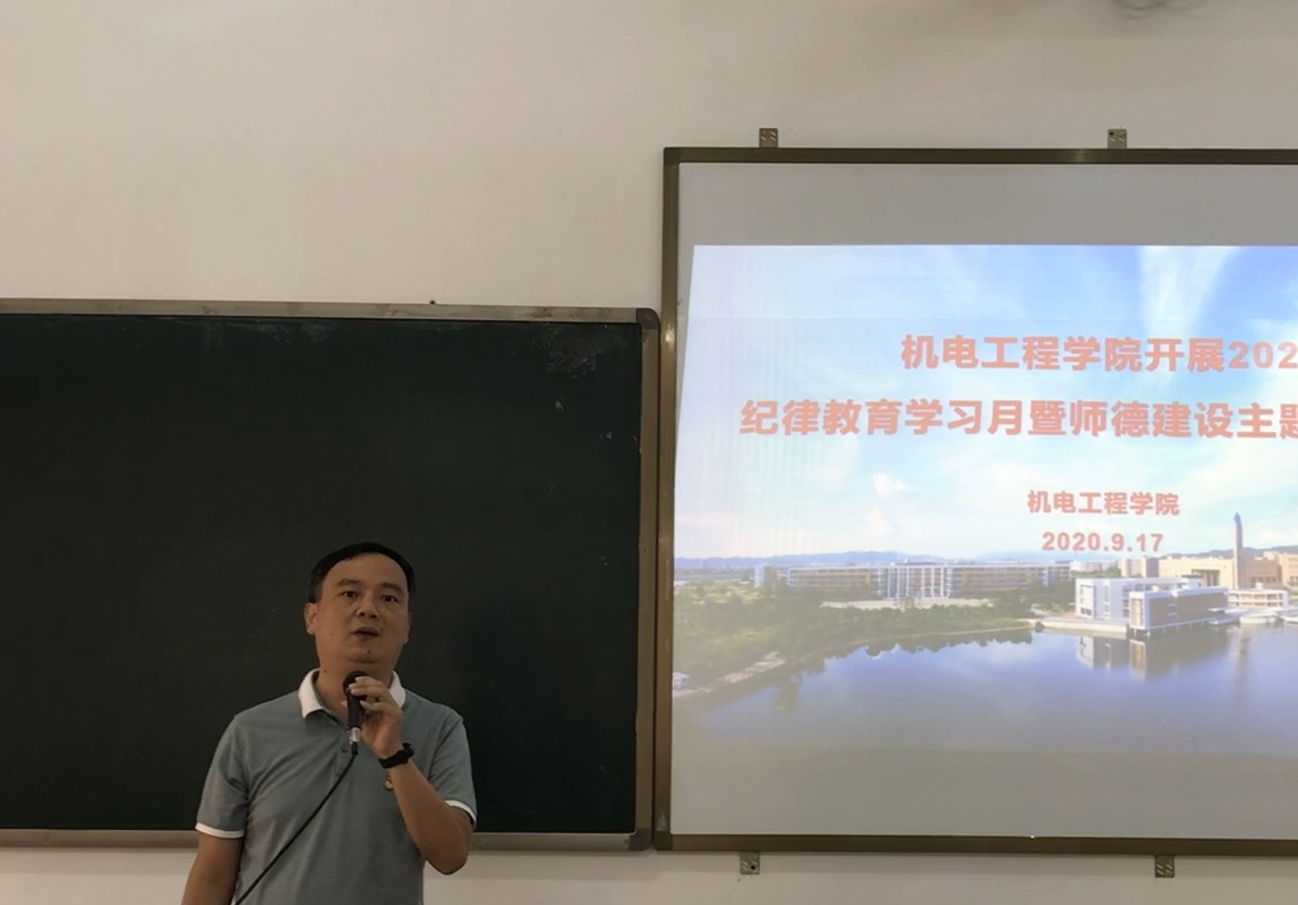 9月17日上午,机电工程学院在实D312召开了2020年纪律教育学习月暨师德建设主题教育月活动布置会及专题辅导讲座。我校副校长赖小景、机电工程学院教职工、师生党员及学生预备党员出席此次活动,活动由黄亮副书记主持。