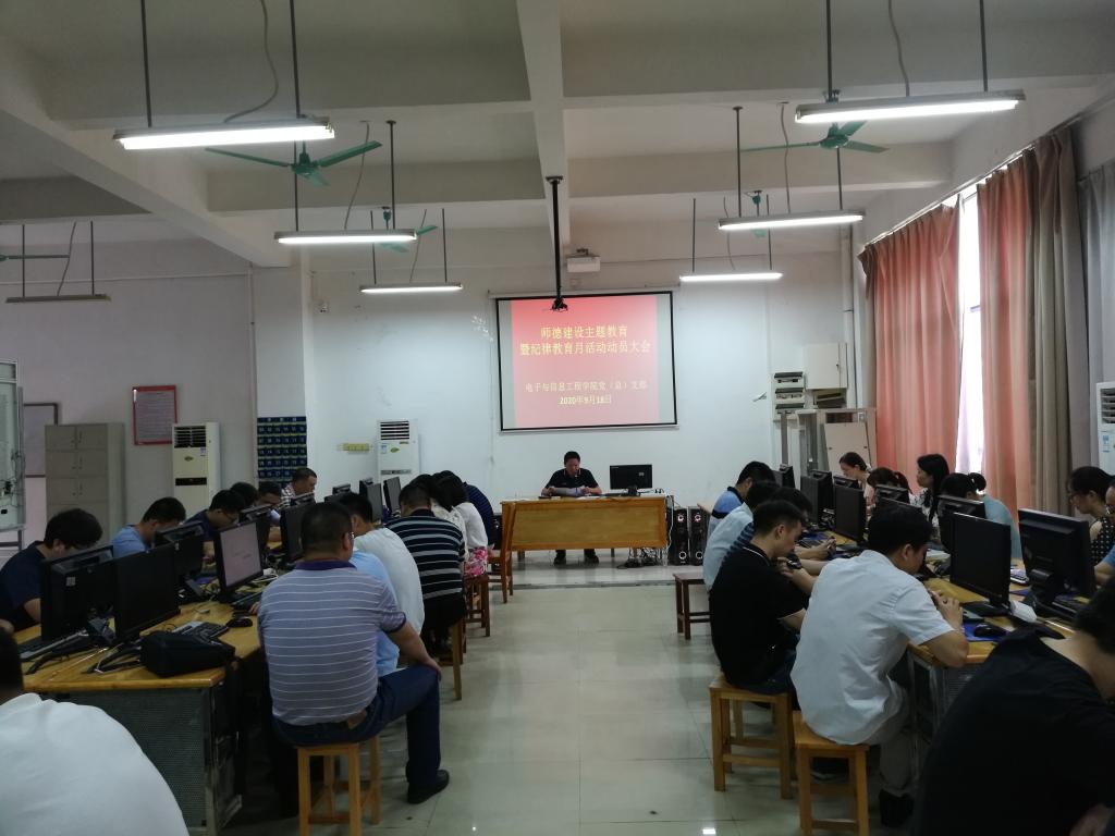 为贯彻落实《教育部等七部门印发<关于加强和改进新时代师德师风建设的意见>的通知》(教师[2019]10号)要求,深入学习贯彻习近平新时代中国特色社会主义思想,推动全面从严治党向纵深发展,2020年9月18日,我院在实训楼A213召开师德主题教育暨纪律教育月学习活动动员大会。