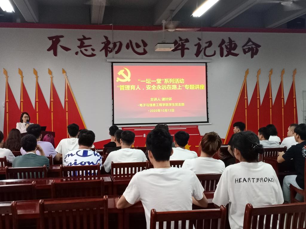 10月13日下午,电信学院学生党支部在电信实训楼B306开展“一坛一堂”系列活动——“管理育人,安全永远在路上”专题讲座,参加本次讲座的人员有学生党支部全体党员、2020级辅导员助理(学长)、学生会学长部全体成员。讲座由学生党支部书记杨日奎主持,谢叶环老师主讲。