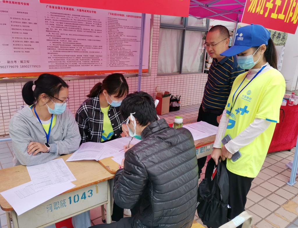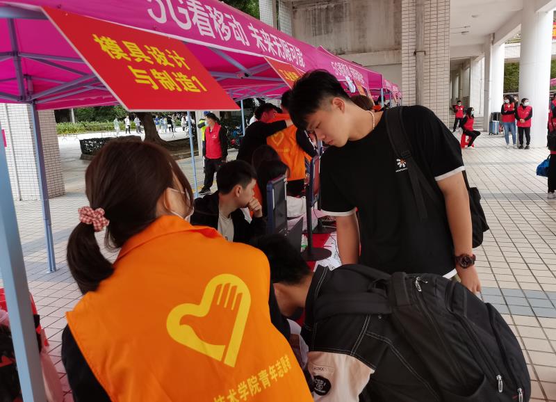 新生通过验证粤康码、全身消毒、体温检测等流程后进入校园,在志愿者的带领下前往教学楼中庭办理报到手续。为保证录取学生的合法权益,今年增加了人脸识别身份验证环节,通过身份核查确认生源信息。