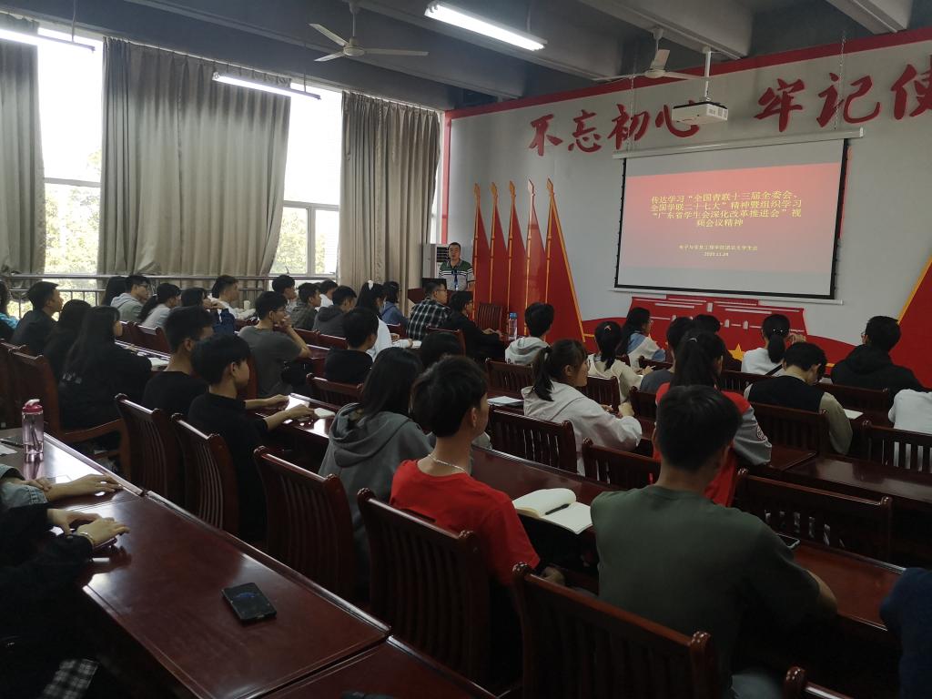 11月24日,电信学院团总支、学生会在实训楼B306开展传达学习“全国青联十三届全委会、全国学联二十七大”精神暨组织学习“广东省学生会深化改革推进会”视频会议精神。参加会议的人员有:第十三届团总支、学生会主席团、正副部长、各专业团支部副书记、宣传委员、各班委团支部书记、宣传委员,会议由团总支书记杨日奎主持。