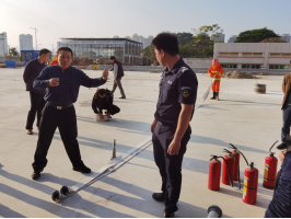 黄旺庆老师从倡导树立消防安全意识出发,提醒教职工要注意掌握科学的防范知识,加强安全避险与自救能力。随后,学校消防员进行消防知识、灭火器使用等相关知识的讲解,还指导教职工正确使用消防栓、灭火器等消防装备。