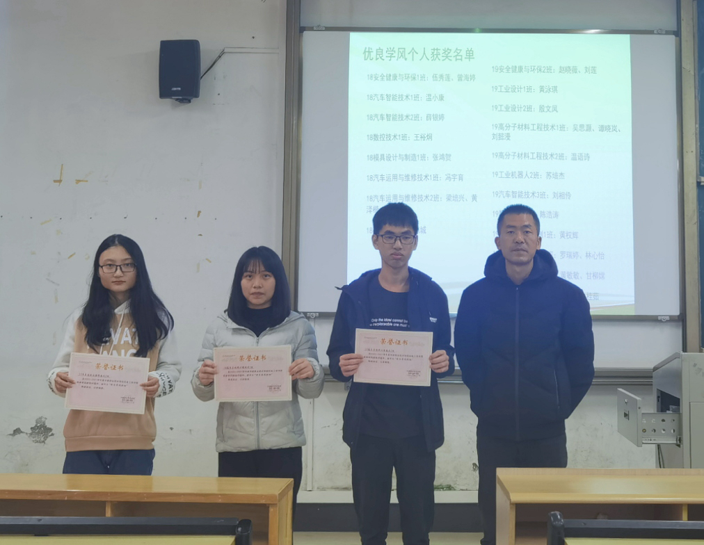 会上,杨成书记宣读《机电工程学院关于表彰2019-2020学年优良学风班级、优良学风个人的决定》,授予19高分子材料工程技术2班等3个班级“优良学风班级”荣誉称号,授予薛银婷、曾江等30位同学“优良学风个人”荣誉称号,并由杨成书记颁发荣誉证书。