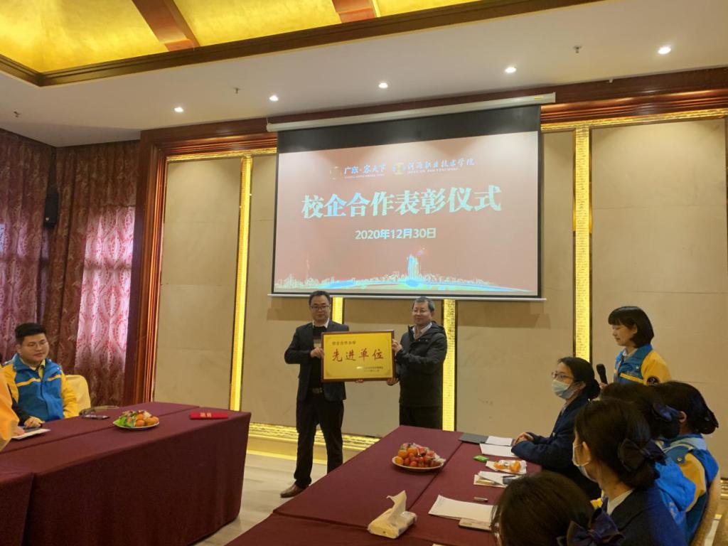 俞彤院长代表学校给河源客天下颁发了2020年校企合作办学“先进单位”和“先进个人”。