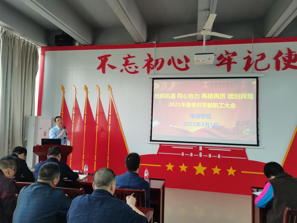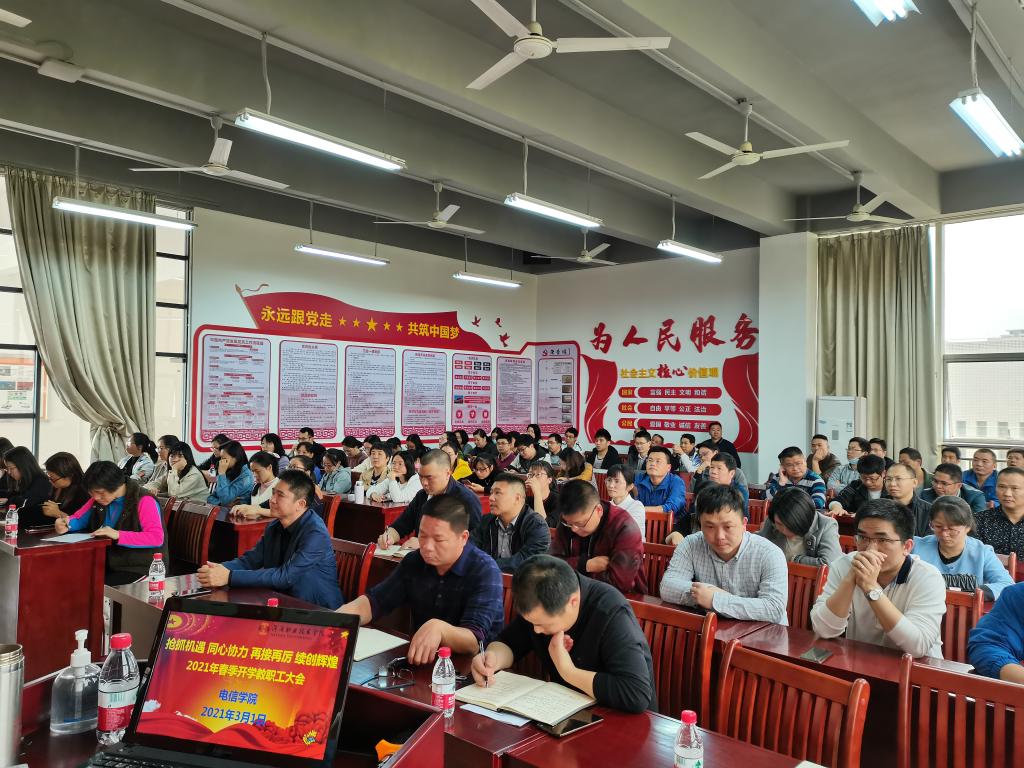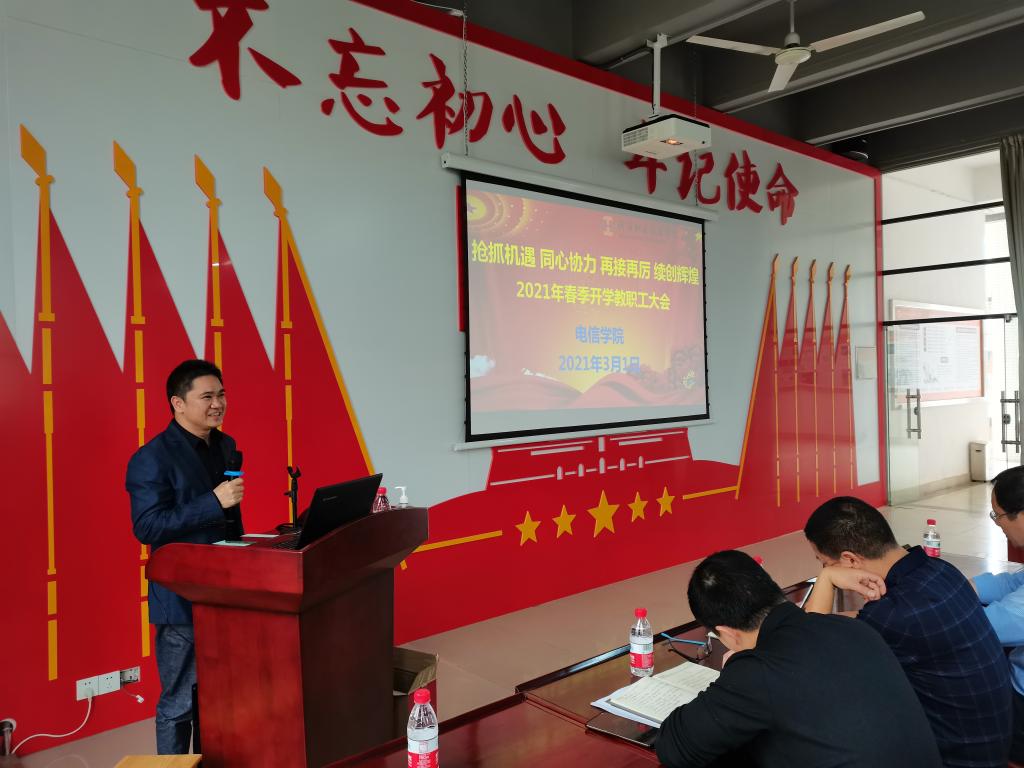2021年3月1日,电信学院在实训楼B306召开了2021年春季开学教职工大会,袁光华副校长及电信学院全体教职员工参加了会议。