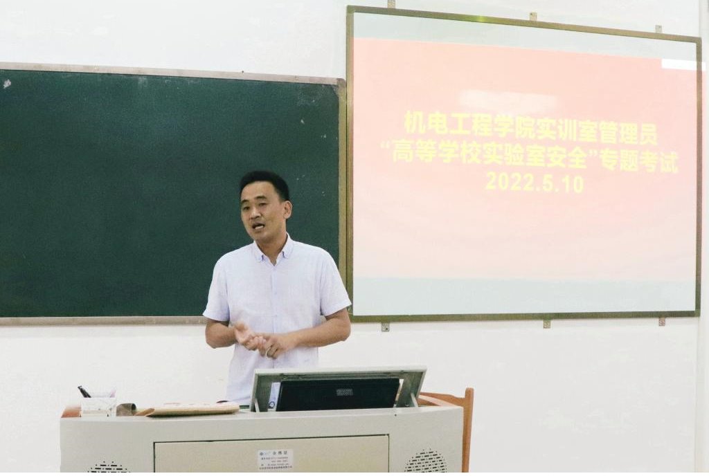 为增强实训室管理员的安全责任意识,提高业务知识及能力,5月10日,机电工程学院在实训楼D312组织了实训室管理员高等学校实验室安全专题考试,学院相关负责人及实训部全体人员参加此次活动。