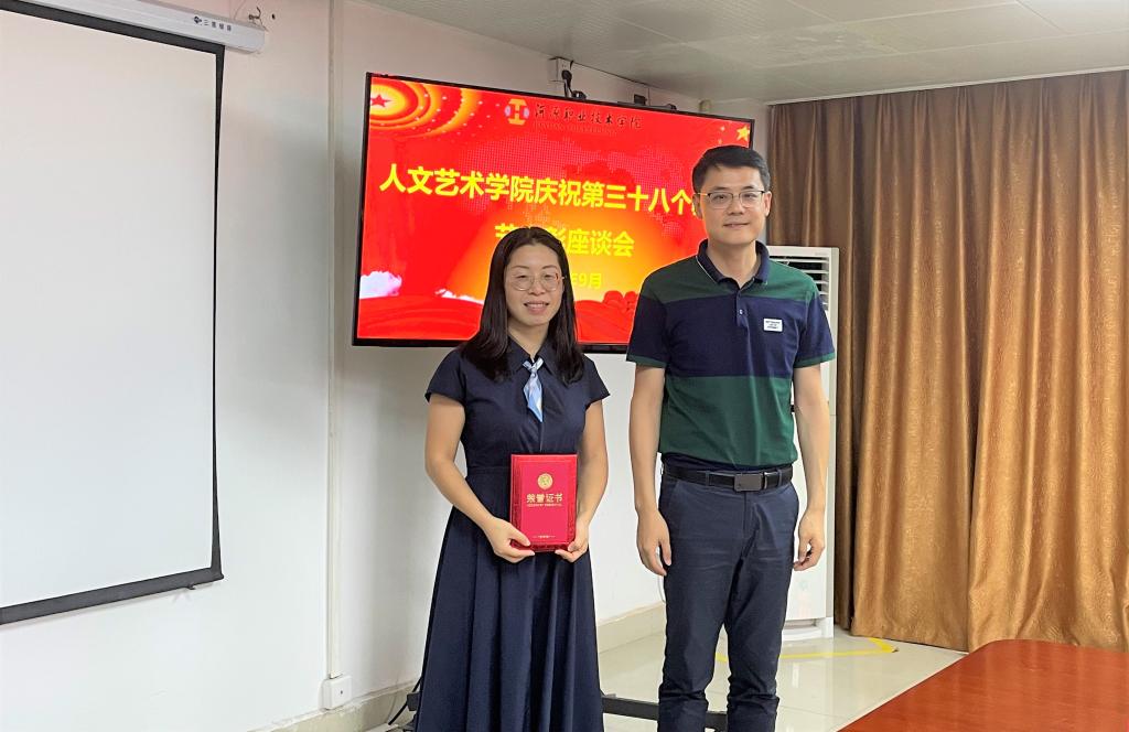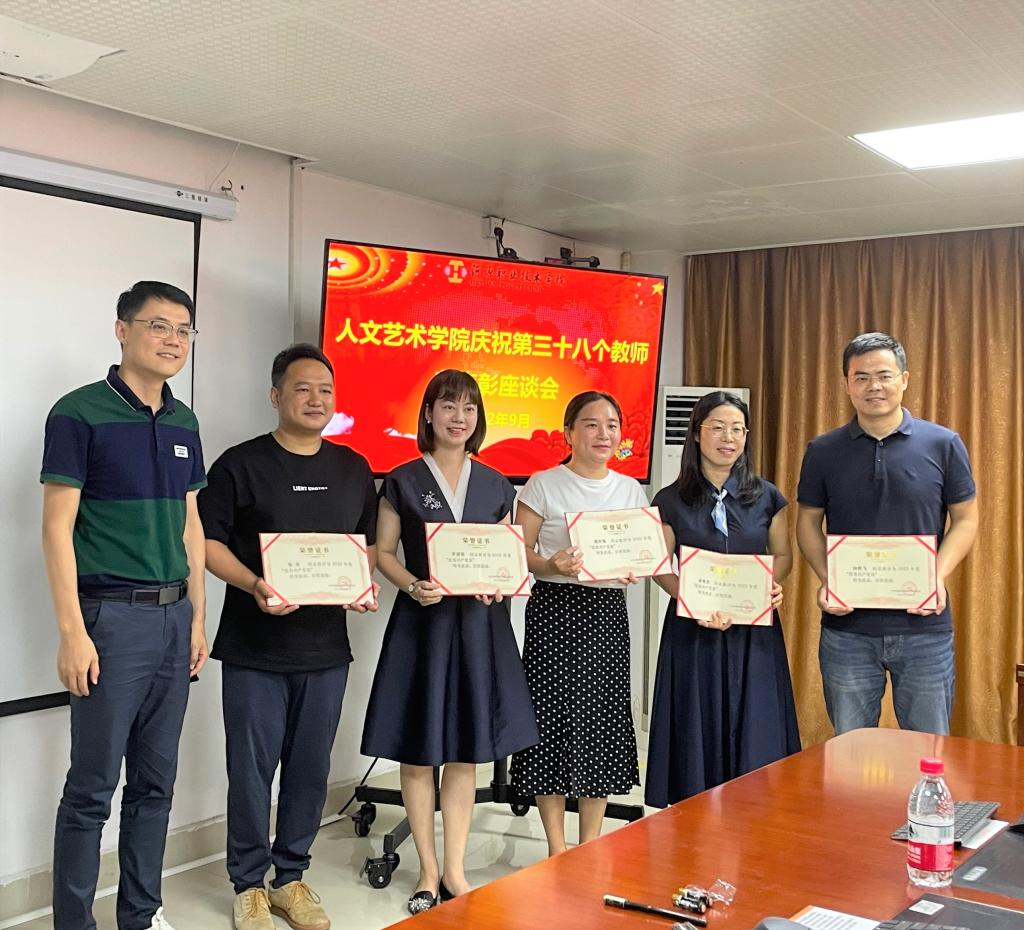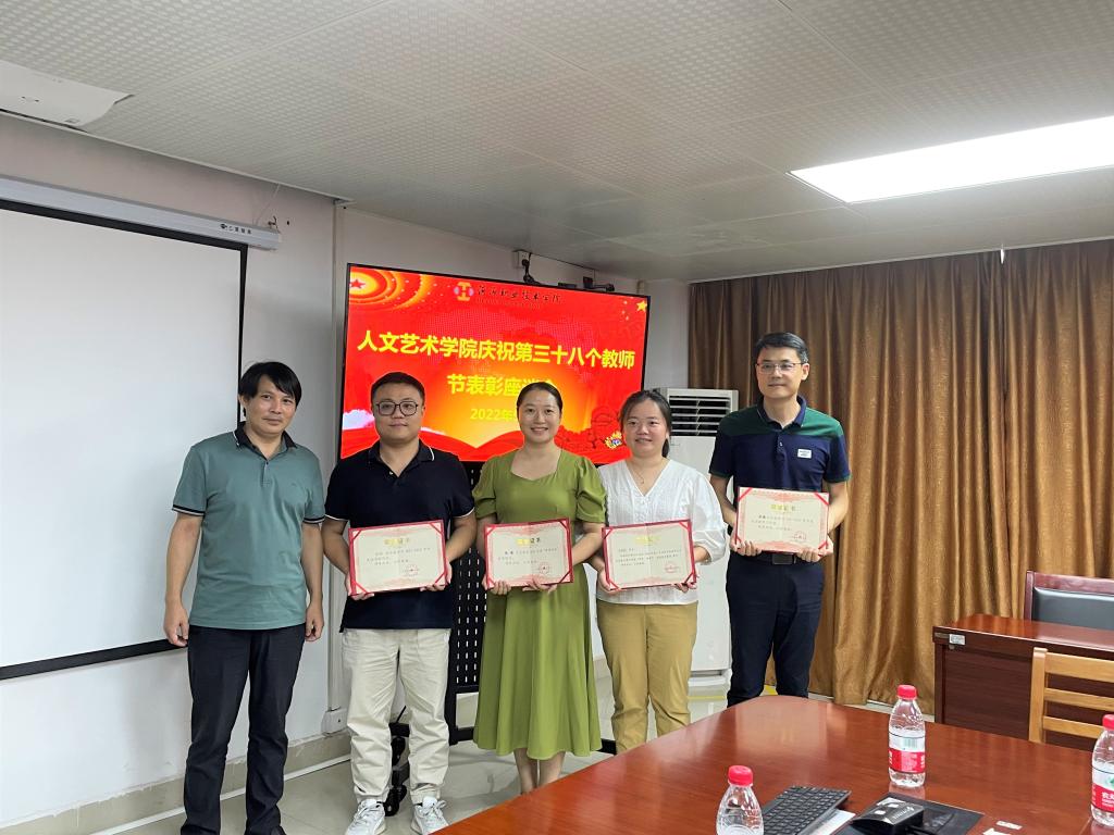 9月8日下午,为庆祝第38个教师节,人文艺术学院在行政楼B601实训室召开庆祝2022年教师节教师表彰座谈会。人文艺术学院班子成员、获奖教职工参加了本次表彰座谈会,会议由学院办公室主任邓华荣主持,学院副书记张超、副院长王方作会议讲话。大会对获得先进党组织、优秀共产党员、优秀教师等荣誉的集体与个人进行表彰,并祝愿全体教职工节日快乐。