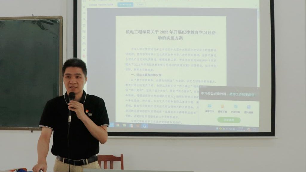 首先,学院党总支纪检委员、副院长廖晓明解读了《机电工程学院2022年纪律教育学习月活动实施方案》,对本次纪律教育月活动的主题、总体安排、学习的主要内容等相关事项逐一进行说明。