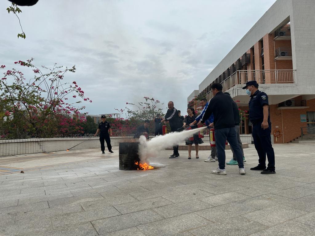 活动中,学校南山安保工作人员介绍了灭火器的使用方法,结合现场演示,讲解了灭火器提、摇、拔、压的要领。在南山安保工作人员的指导下,学院全体老师及学生代表轮流进行实战灭火演练。