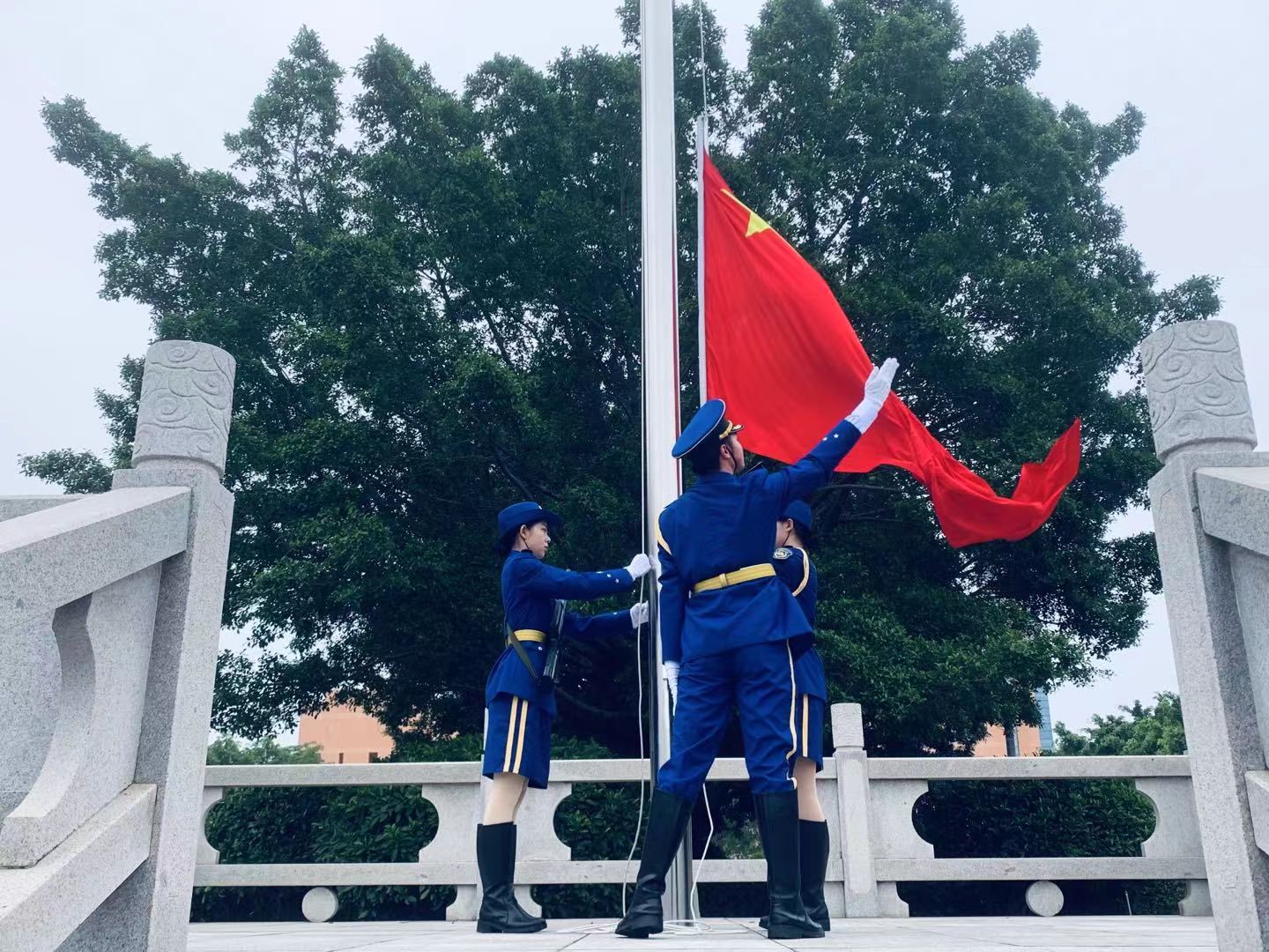 在师生的注目下,国旗护卫队护卫着国旗,迈着矫健的步伐,精神抖擞地走向升旗台。伴随雄壮激昂的国歌声,升旗手振臂一挥,鲜艳夺目的五星红旗旗冉冉升起,迎风飘扬。
