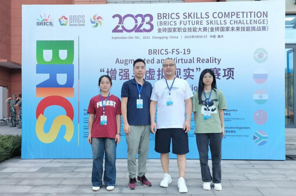 2023年金砖国家职业技能竞赛增强与虚拟现实赛项于9月6日至8日在重庆电讯职业技术学院举行,由我校刘俊英、曾天文老师指导的模具设计专业学生黄映婷、谭秋玲同学参加竞赛,在57支参赛队伍中脱颖而出,荣获一等奖。