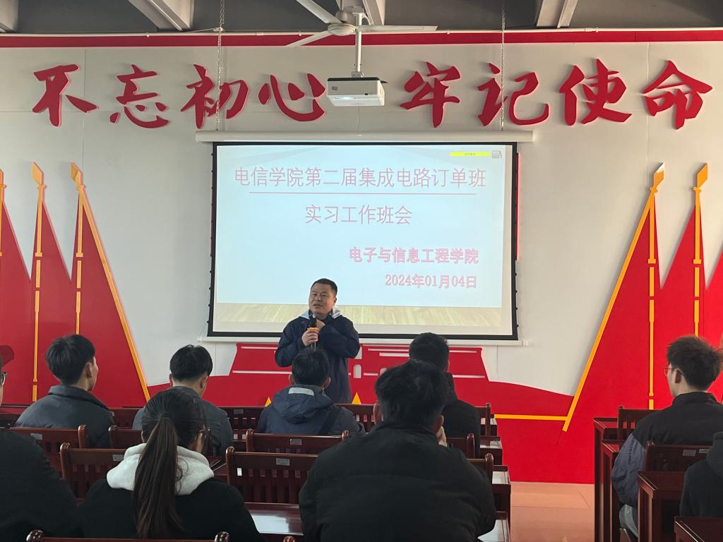 2024年1月4日,为了确保“集成电路订单班”实习工作的顺利开展,我院在实训楼B306教室举行第二届“集成电路订单班”实习工作班会。会议邀请了即将去实习的企业代表来校讲解,周永福副院长、电信学院2024届各专业“集成电路订单班”报名的毕业生参加了本次实习工作班会,会议由贺小艳老师主持。