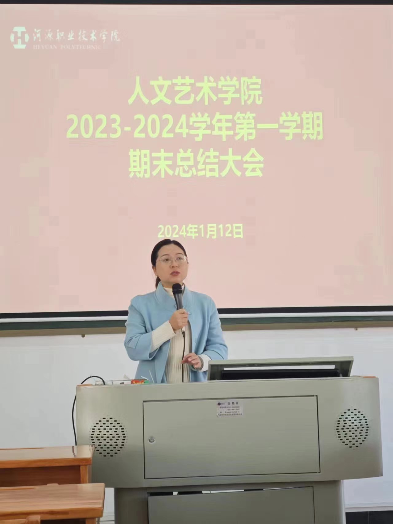 1月12日下午3点,人文艺术学院在机电实训楼D508召开2023-2024学年第一学期期末总结大会,学校副校长袁光华和学院全体教职工出席本次会议。