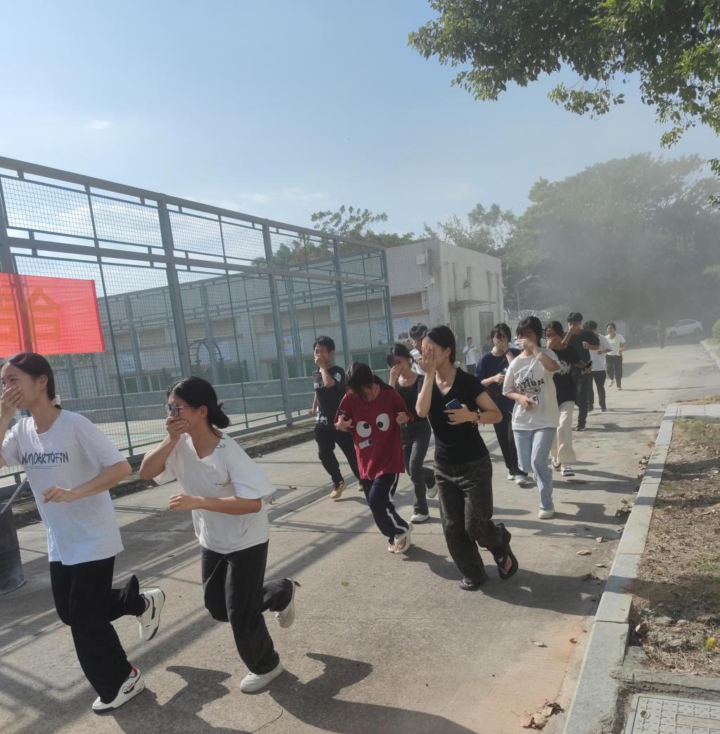随着报警声响起,浓烟弥漫,学生在老师指引下,捂住口鼻,降低身姿,快速有序地撤离至安全地带并清点好人数。整个疏散过程配合默契,疏散路线清晰。