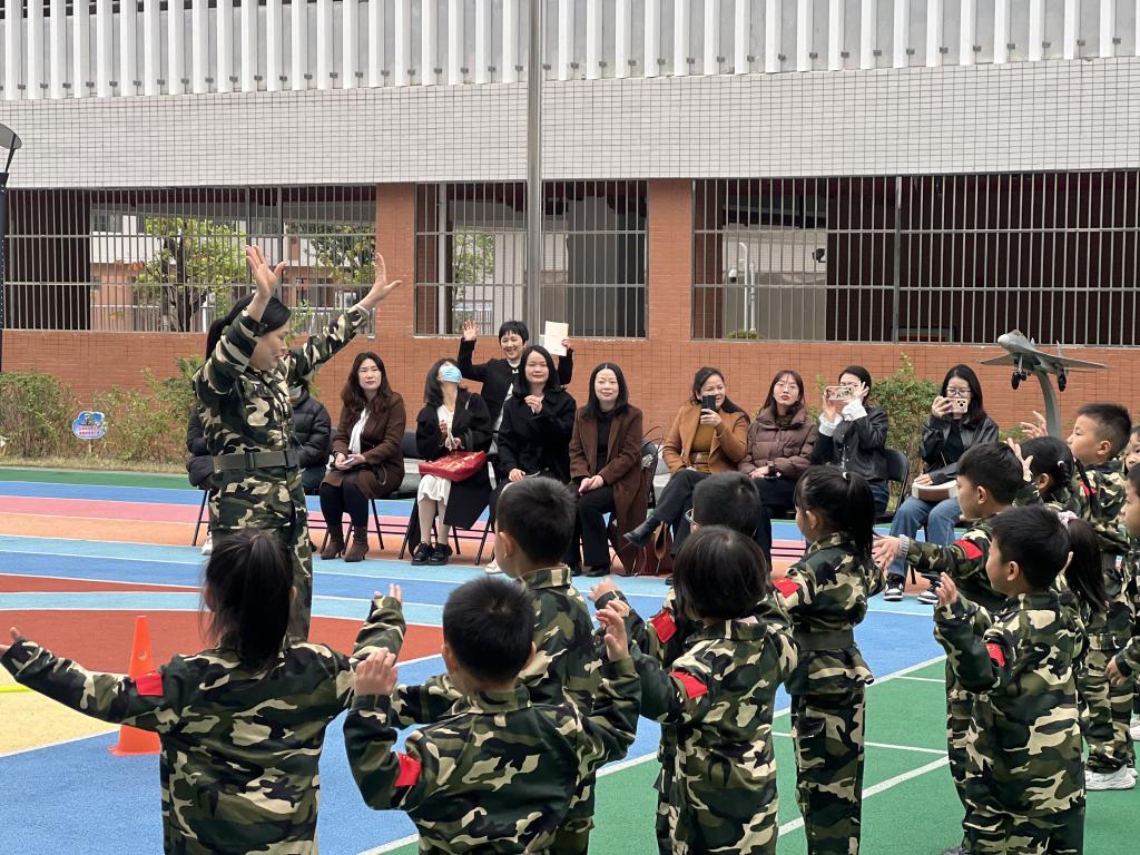 学前教育教学团队首先观摩了大班体育活动《娃娃兵智取敌方军用物资》。该课程以军事主题情境贯穿始终,通过探险智取“军用物资”游戏,培养幼儿团队协作、问题解决及运动规划能力。教师巧妙融入“突发险情”“运输物资”等游戏化元素,让观摩教师直观感受“玩中学”理念的落地实施。