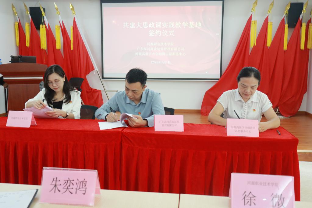为深入贯彻落实全国高校思想政治工作会议精神,落实立德树人根本任务,推动大学生思想政治教育创新与实践深度融合,7月1日上午,我校与河源高新区点创融湾志愿服务中心、广东深河商业运营管理有限公司,三方在深河共建产业园区党群服务中心正式签署协议并揭牌,共建“大思政课”实践教学基地。马院办公室负责人徐微、思政课实践教学中心主任毛丹、思政教师施钰泷、黄金萍,高新区点创融湾志愿服务中心理事长陈浩山,广东深河商业运营管理有限公司总经理朱奕鸿,以及20余名学生代表及志愿者参加活动。