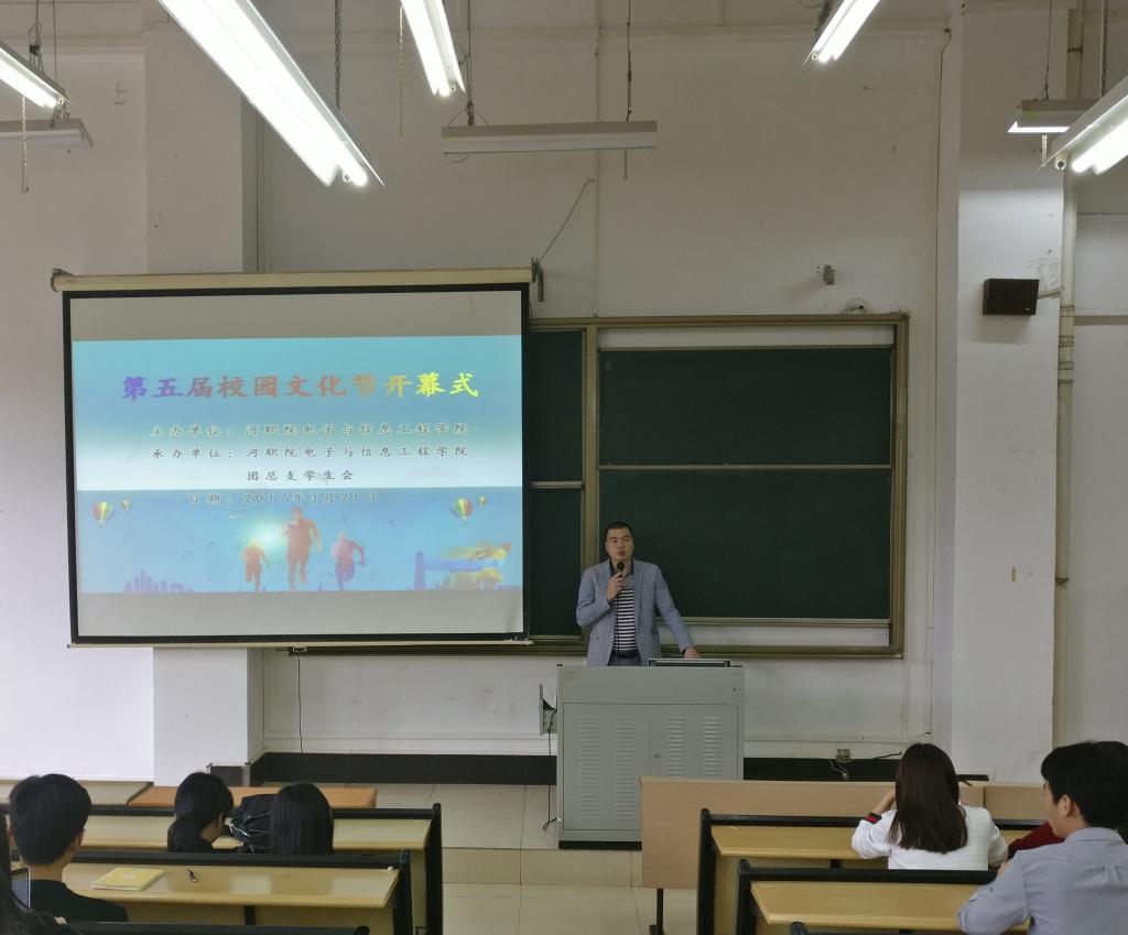 开幕式上,首先团总支副书记刘欣瑜同学分享自己的一些经验。然后,杨日奎对第五届校园文化节活动方案进行讲解,并要求专业团支部和班级团支部做好详细的工作部署,组织同学们积极参加文化节的活动,团总支学生会各部门根据总体部署做好活动比赛方案,各专业作品按时上交,评委评选出名次并将结果公布。最后,杨日奎要求各学生干部要有计划、有组织、有安排、有思想地按照学院工作部署,做好带头作用;各班委、专业团支书要召开关于文化节分析主题会议,使同学们更加清楚并参与到文化节当中。